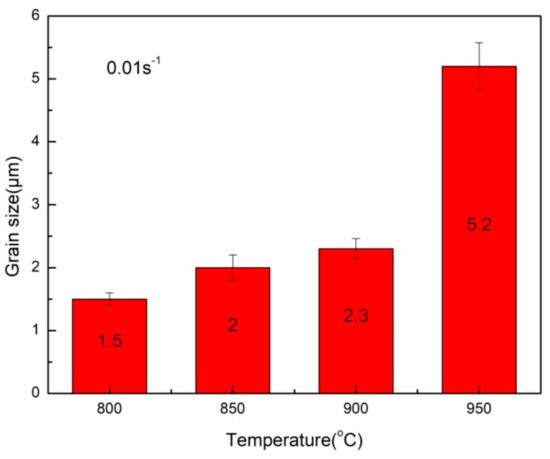 The SEM and OM images from the deformed specimens and at the strain rate of ε = 0.01 s−1 and various temperatures are shown in Figure 5. The variation of α grain size with temperature at the strain rate of ε = 0.01 s−1 is shown in Figure 6. The diameter of equiaxed α phase increases with increasing deformation temperature. In the sample deformed at 800 °C (Figure 5a,b), the matrix microstructure mainly consists of equiaxed α grains with an average diameter of 1.5 μm (Figure 6) and few residual β grains which are elongated perpendicular to compression direction by the rolling force. Similarly, the TiBw are also distributed uniformly perpendicular to compression direction. When the deformation temperature is 850 °C (Figure 5c,d), the distribution of equiaxed α grains (of which the diameter is about 2 μm), residual β grains and TiBw are similar to Figure 5b.
