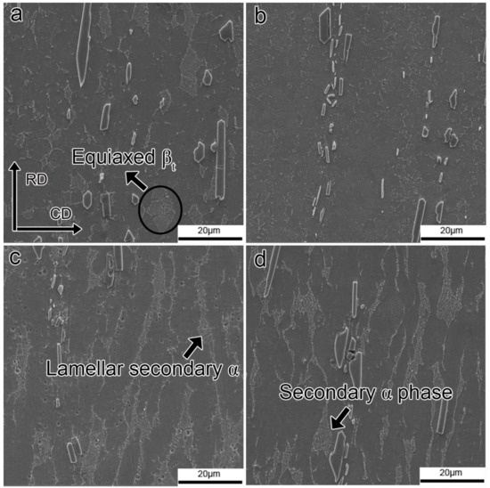 From the above results, it is apparent that the matrix microstructure is significantly influenced by deformation temperature. At the strain rate of 0.01 s−1, the content of primary α phase (αp) decreases with increasing temperature. This phenomenon can be attributed to the transformation of more α phase to β phase at higher temperatures. At different deformation temperatures the primary α and β phases play different roles in hot deformation. At lower temperatures (800–900 °C), the primary α phase acts as a dominant phase and fine equiaxed α grains confirm the occurrence of DRX. The soft β phase is unlikely to make major contribution during hot deformation, thus the flow stress is high. However, with increasing deformation temperature more primary α phase transform into β phase, and final transform into βt (fine needle/lamellar secondary α phase and residual β phase) during the cooling process as shown in Figure 5. It is known that the body centered cubic (bcc) β phase has a single close packed <111> direction, several activated sliding planes and lower strength than hexagonal close-packed (hcp) α phase [27]. Therefore, the β phase acts as a dominant phase during deformation when the β phase content increases to about 50 vol.%. Thus, as shown in Figure 2d, the flow stress dramatically decreases with increasing temperature to 950 °C. Meanwhile, the decreased flow stress is related to the mobility of dislocation in the primary α phase. At higher temperatures, the dislocation movement is easier.
