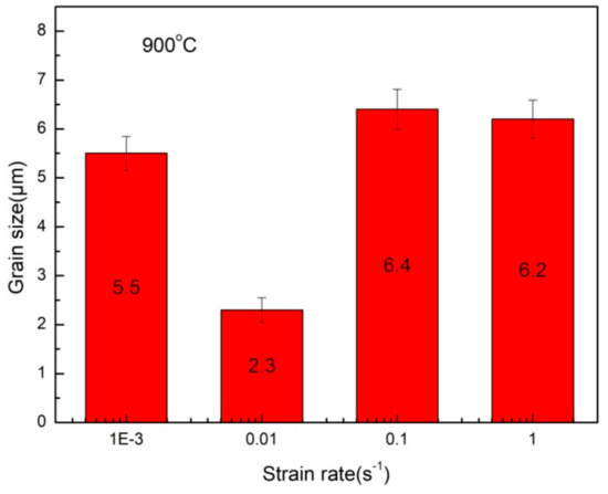 Figure 8 shows the microstructure of the TiBw/near α-Ti composite specimens deformed at 900 °C and various strain rates. Figure 9 shows the variation of α grain size with strain rate at 900 °C, we found that α grain size is smallest at the strain rate of 0.01 s−1. The morphology of αp and β grains changes with strain rate and the αp is a dominant phase. At lower strain rates (Figure 8a,b), both αp and βt appear equiaxed and are not elongated perpendicular to compression direction, indicating the DRX is the dominant softening mechanism. The measured average DRXed α grain size increases from 2.3 μm to 5.5 μm (Figure 9) and the proportion of βt increases with decreasing strain rate, which are ascribed to sufficient time for grain growth and phase transformation (α → β). At higher strain rates (Figure 8c,d), the αp and βt are elongated perpendicular to compression direction. In addition, the coarser α grains (Figure 9) and the elongated α grains with the straight boundary indicates low degree of dynamic recovery and dynamic recrystallization due to the insufficient time at high strain rates [22]. We also found that the length of lamellar secondary α phase, embedded in βt, decreases with increasing strain rate from 0.1 s−1 (Figure 8c) to 1 s−1 (Figure 8d). The spheroidization of secondary α phase is more obvious. Furthermore, as the strain rate increases, the proportion of βt increases with strain rate, which is ascribed to the adiabatic temperature rising caused by the low thermal conductivity of titanium during the high strain rate deformation [33].