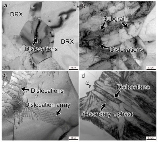TEM micrographs are shown in Figure 10 to investigate the effect of the strain rate on the evolution of matrix microstructure. The fine DRXed grains with relatively low dislocation density are observed in Figure 10a. As shown in Figure 10b, some subgrains and dislocations exist in the αp, indicating occurrence of CDRX. The high dislocation density in the αp and lamellar secondary α grain is visible at high strain rate of 1 s−1 (Figure 10c,d), forming dislocation arrays.