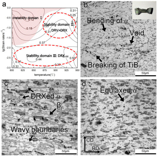 The stability domains II and III correspond to lower strain rates and higher temperatures. The microstructure of stability region II is shown in Figure 11c, which corresponds to the sample deformed at 950 °C/0.1 s−1. Under this deformation condition, the microstructure mainly consists of elongated primary α colonies and βt. The wavy boundaries of elongated α colonies indicate that dynamic recovery (DRV) is the dominant softening mechanism. A similar phenomenon can be seen in Figure 8c, as discussed in Section 3.2.2. Furthermore, some equiaxed α grains can be found in Figure 11c, which demonstrates CDRX of some primary α grains. The CDRX in primary α grains is the dominant softening mechanism at 900 °C/0.001 s−1 for region III (Figure 11d). As discussed in Section 3.2.1, at temperature of 800–950 °C and low strain rates, there are sufficient dislocation strain energy and thermal activation for the CDRX in primary α grain or β grain.