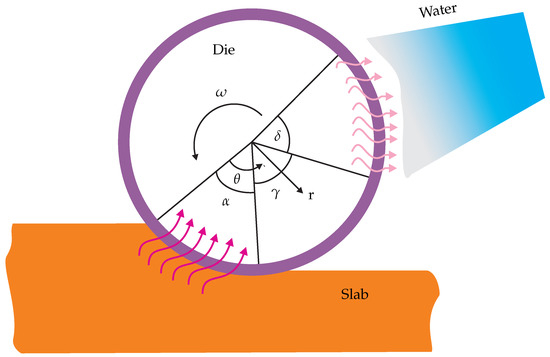 where indices s and r denote the slab and the die, respectively; is the coefficient of heat transfer between the roll and the slap; represents time as measured from the instant of the first contact of the rolling die and slab surface calculated from Equation (3); , , P, , and are the thermal conductivity of the die and slab, the mean pressure, the density, and the specific heat of the roll material, respectively; is the initial temperature of the strip; and is the temperature of the die-body, where is described in Reference [14]