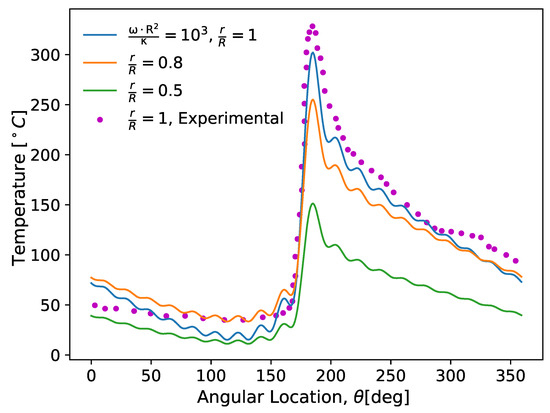 where is the ambient temperature and is the temperature on the surface of the rolling die before getting in contact with the slab. , , , , , , and f are given in Appendix A. To measure the thermal loads, thermocouple wires were used by implanting in the drilled holes of the rolling die body at the distance of 0.8 mm from the surface. The thermocouple measures the integrated temperature sensor at contact and at the cooling application. The thermal measurements give very detailed information about the temerature field. An inverse heat conduction mode has been developed to compute thermal stresses on the surface boundary condition from the measured temperatures. The Minitab® 17.1.0 software was used to analyze the experimental data. Figure 5 represents the setup of an apparatus for a thermal analysis under hot rolling. This rolling process represents complex equipment which corresponds to all the parameters of a hot rolling process incorporation in the technological process of industrial production. Regarding the factorial design and controlling, the mechanism detail information is found in Reference [23]. Considering the stress condition discussed in this section, the model is computed in the computational software (python), and the result is shown in Figure 6 and Figure 7. For this method, mm, C, and GPa were used. The result shows that circumferential stress can induce tensile and compressive stresses that can lead to thermal deformation under the plane-strain mode with the given thermal properties of the rolling die and rotational angles. As given in Figure 7, the results from the numerical analysis show an acceptable range of a good agreement with the experimental data.