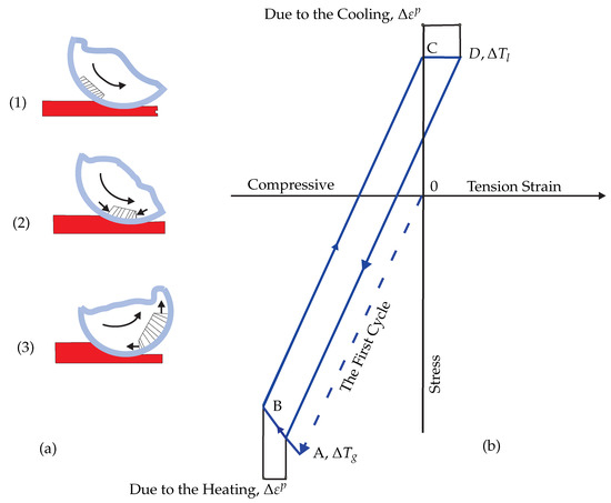 where and are the diameter and thermal expansion of a rolling die, respectively. A simplified method to estimate the elastoplastic cyclic behavior in hot work conditions for the die is developed as shown in Figure 4a,b. Assuming that compressive stresses in contact area due to heating (line OA) induce yielding stress at a temperature of certain value (point A), a further increase of the temperature may induce compressive plastic strains (line AB). The subsequent surface cooling produces tensile stress: first elastic stress (line BC) and then plastic stress (line CD). The loop closes in the subsequent heating. The approximate hysteresis loop (shown in Figure 4b) is constructed from the elastic, circumferential stress-strain loop with the following assumptions: