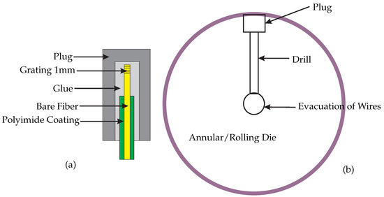 The rolling die/annular for instrumentation: (a) An optic fiber sensor arrangement to plug into the drilled hole and (b) a typical optic fiber sensor position.