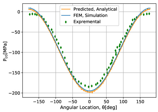 In this work, to evaluate the proposed models, an experimental setup was built. To get the experimental data, one set of optical fiber sensors is used under the rolling die surface (close to the surface). Sensors are glued into the blind bore beneath the surface, where a 50-mm cylindrical piece of metal is plugged. This plug is inserted into the rolling die, as shown in Figure 8, in order to measure the radial strain during the rolling process. The physical calibration system consists of all the apparatus coupled with mechanical components, electrical devices, and sensors during the data recording time. Strain gauge rosettes are integrated with the sensors to measure the strain at each point, where the stress can be calculated from strain values. Further details about this measurement procedure are also available in References [26,27]. The comparison between the analytic and finite element simulation results with experimental data is presented in Figure 9. Considering the initial load to be 90 MPa for both computational analyses, the result shows some variabilities, most likely due to the initial load over the whole cyclic contact during the experiment made.