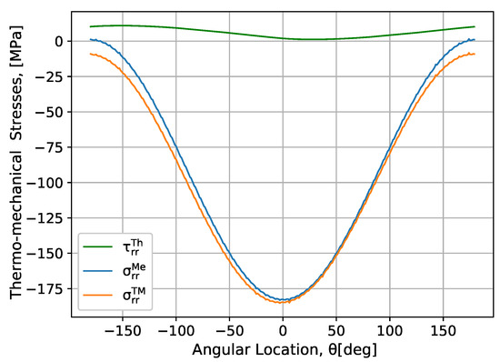 Figure 10 shows the comparison of the , , and stresses for a given number of cyclic loads and an initial contact load of 90 MPa. Upon comparison, a mechanical radial stress is greater than the thermal radial stress, where the coupled TM stress is more pronounced among the two stresses in the rolling gap. In the same way, a comparison is made for the , , and stresses that are shown in Figure 11, where the result show that the TM stress is the most damage contributor among the individual stresses. However, the direction of the and stresses are different in the rolling gap. At the end, the damage accumulation is obtained from the combination of the two stresses. In short, TM coupled stresses have a significant effect on a structure’s strength and stability of materials with all loading scenarios.