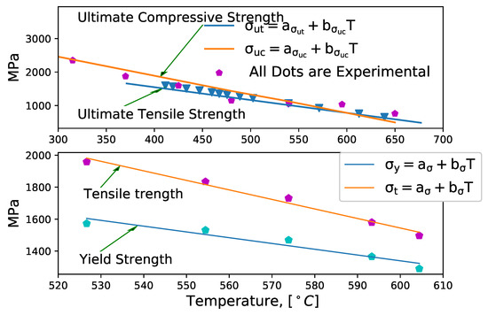 The mechanical properties of the H13 tool steel material model are proposed for various temperatures as given by Equations (72)–(74). Realistic results are depicted in Figure 12 and Figure 13 with the proposed constitutive equations and where the results show that mechanical properties of H13 tool steel material highly depend on the temperature variables. To obtain the values of assumed variables, optimization curve fitting is implemented corresponding to the experimental data, where values are given in Appendix B.