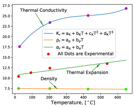 In the same way, the thermal properties of H13 material are extremely temperature-dependent (as depicted in Figure 14) except the density. Accounting for a wide range of temperatures, the H13 material response to thermal loads is modeled using a polynomial curve fitting method using the following relations