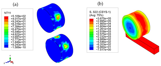 The temperature and stress distribution on the rolling die surface where the slab temperature is T = 1000C: (a) Heat generation and stress accumulation due to the contact under a rolling gap (Increment = 1 × ) and (b) a tangential stress distribution (Increment = 1 × ).