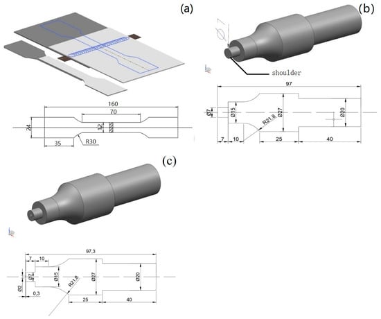 (a) Welding schematic diagram, (b) welding tool without pin and (c) welding tool with 0.3 mm pin.