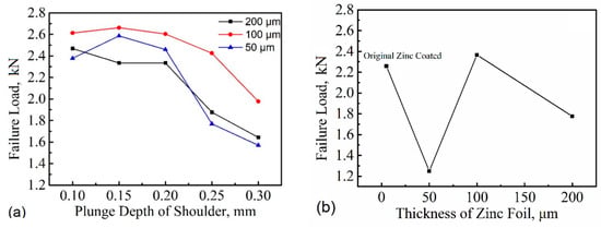 (a) The change of tensile load with the plunge depth of the shoulder and (b) maximum tensile load varies with zinc foil thickness.