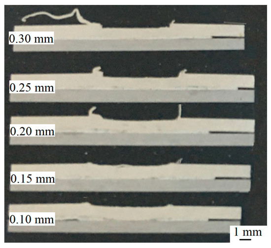 Figure 5 shows the metallographic sample obtained by electric spark cutting after the welding process. The metallographic sample was inlaid and polished to obtain smooth weld cross-section. Figure 5 shows the cross section of the welded joint obtained using the same zinc foil thickness and welding parameters but different shoulder plunge depths. The plunge depth from bottom to top was 0.10 mm, 0.15 mm, 0.20 mm, 0.25 mm, and 0.30 mm. It can be clearly observed from Figure 5 that as the plunge depth increased, the degree of thinning of the upper 6061-T6 base material layer also increased, and the burr also gradually increased.