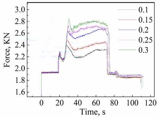 The pressure sensor was also used to collect the axial force during the welding process, as shown in Figure 7. With the same zinc foil thickness, the axial force increased with increasing plunge depth, and the number increased exponentially. In the work by Y. C. Chen et al. [12], the axial force during the welding process was 5.88 kN and the best welded joint was obtained with 0.1 mm and 0.2 mm plunge depth. The axial force in our case was only 2.7 kN, which is far lower than the axial force of the conventional friction stir welding process and greatly reduced the welding deformation; this approach is especially suitable for thin plate welding.