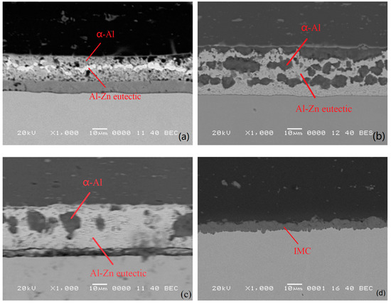 Galvanized steel sheets are mainly electro-galvanized steel sheets, alloy electro-galvanized sheets, hot-dip electro-galvanized sheets and alloy hot-dip electro galvanized sheets, of which hot-dip galvanized steel sheets are inexpensive and have the best corrosion resistance [20]. Therefore, a rectangular hot-dip galvanized steel sheet with the size of 150 mm × 80 mm × 1 mm and a 6061-T6 aluminium plate was selected for testing. The base materials were wiped with alcohol before the test to remove the greasy dirt on the surface of the test plate. The composition of the hot-dip galvanized steel sheet is shown in Table 1 (the thickness of the galvanized layer was approximately 10 μm). The microstructure is shown in Figure 2a.