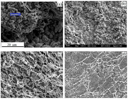 The tool without pin was used for the FSW of the 6061-T6 and zinc-coated steel with zinc foil at the interface. However, the thickness of zinc foil greatly influenced the phase of the joint interface. In this situation, when without zinc foil, the Al–Zn eutectic generated below the shoulder was pushed into the edge of the tool shoulder by the tool gradually penetrating into the upper sheet. However, because of the lack of localized pressure, the Al–Fe IMC was not generated at the interface. Thus, when the tool was without a pin and without zinc foil, the weldability was not good. The experimental results show that the addition of zinc foil can improve the strength of the joint. When the 50 μm zinc foil was used, as shown in Figure 9a, Al and zinc were combined to form Al–Zn eutectic at the interface. The compositions are shown in Table 4 and Table 5. When the penetration depth was excessively large, because the affinity between Al and Fe is much stronger than that of Zn and Fe [24], the original zinc coating contained a small amount of Al, so the Al–Zn eutectic was based on Al generated as the layer approached the steel surface. At the same time, the segregation of excrescent zinc occurred at the middle of the interface. The intergranular fracture took place at the segregation layer, and the micro-morphology is shown in Figure 10a. When the 100 μm zinc foil was used, Al and zinc were combined into the Al–Zn eutectic at the interface. However, Al could not diffuse into the entirety of the zinc foil. Therefore, the upper Al–Zn eutectic consisted of Al–Zn eutectic rich in Al, and the lower Al–Zn eutectic consisted of Al–Zn eutectic rich in Zn, as shown in Figure 9b. The two kinds of phases were mixed together, and the joint performed well during the tensile test. The fracture took place on the advancing side of the 6061-T6 aluminium. After the tensile test, the joint became detached. Figure 10b shows that the dispersed distribution of the Al–Zn eutectic rich in Al is among the Al–Zn eutectic rich in Zn, which prevented intergranular fracture. When 200 μm zinc foil was used, as shown in Figure 9c, the interface behaviour was similar to that with the 100 μm zinc foil. For thick Zn foil, the whole interface consisted of Al–Zn eutectic rich in zinc, and only the top of the interface contained a small amount of Al–Zn eutectic rich in Al. The fracture took place at the advancing side of the 6061-T6 aluminium. The micro-morphology of the fracture is shown in Figure 10c.