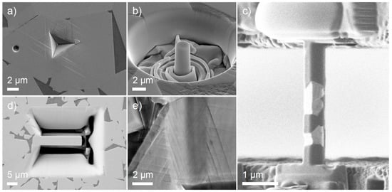 - Kiener, D.; Motz, C.; Dehm, G.; Pippan, R. Overview on established and novel FIB based miniaturized mechanical testing using in-situ SEM. Int. J. Mater. Res. 2009, 100, 1074–1087. [Google Scholar] [CrossRef]