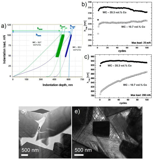Characteristic indentation load vs. indentation depth relationship for two investigated systems with different cobalt contents. (a) Indentation depth values during the first cycle (hmax) and after 100 cycles; influence of the number of cycles on the depth of impression under a maximum indentation load of (b) 25 mN and (c) 200 mN; (d) TEM micrograph of the damaged zone just beneath the indenter tip after cyclic fatigue test (200 mN/100 cycles) in WC–Co with lower Co content; (e) TEM micrograph showing the structure of the deformed binder of the damaged zone just beneath the indenter tip after cyclic fatigue test (200 mN/100 cycles) in WC–Co with higher Co content. Reproduced from [], with copyright permission from Elsevier, 2013.