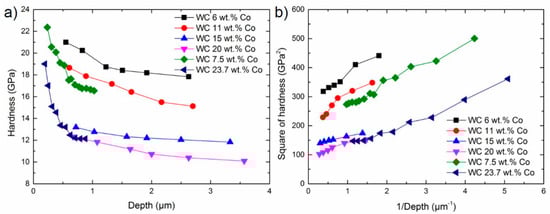 The size effect in the case of cemented carbides with varying volume fraction of binder phase and WC grain size is shown in Figure 4a. It can be seen for all systems that the hardness decreases with increasing indentation depth and that this effect is greater for systems with greater hardness.