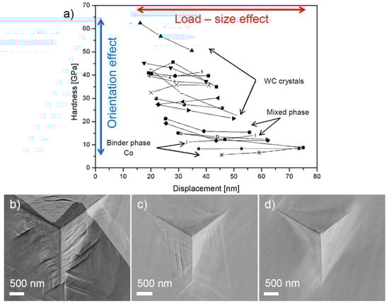 A nanoindentation test on WC grains in a WC–Co system found a clear load-size effect at the nano-level for loads up to 1 mN, with a more visible load-size effect at higher hardness values (Figure 5a) []. However, the indentation load size effect (ISE) is negligible for the binder phase, with an average hardness value of around 8 GPa.