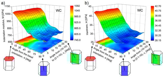 The (a) indentation modulus and (b) hardness of WC grains as a function of the grain orientation in 3-D representation [].