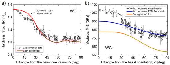 In addition to ISE, the hardness anisotropy (as shown in Figure 5) has also been widely studied, firstly using macro- and micro-indentation on WC single crystals and later by nanoindentation of WC grains in WC–Co. A list of these works is given in Table 1 [,,,,,,,,,,].