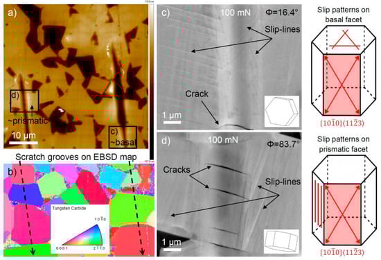 The influence of the crystal orientation of WC grains in WC–Co-cemented carbide on their nano-scratch resistance has been recently investigated, in a similar manner to the dependence of the hardness [] (Figure 8). In Figure 8a, characteristic scratch lines, created by 100 mN loads and crossing differently-oriented WC grains, are shown in an AFM micrograph where grains of near-basal and prismatic orientations are marked. The corresponding EBSD map, on which the grain orientations and the scratch directions are visualized, is shown in Figure 8b. Anisotropic deformation characteristics are visible in Figure 8, with different surface morphologies visible in the SEM micrographs taken of the marked grains with basal and prismatic orientations (Figure 8c,d, respectively). The scratch width is much wider for prismatically-oriented grains than for the grains with basal orientation. Furthermore, parallel slip lines are visible in prismatic orientation, unlike the basal case, where the intersections of the slip planes form triangular reliefs (Figure 8c,d), in agreement with the results of the EBSD measurements. The examination of the observed slip lines suggests that most probably the {10-10}<11-23> type slip system is activated. During the scratch test, numerous cracks were also observed, both inside the WC grains and located at the WC–Co and WC–WC interfaces. On investigation, it was established that the positions of the intragranular cracks were strongly influenced by the grain orientation. Crack lines were visible in the 1010-type prismatic grains. They were perpendicular to the produced slip lines irrespective of the grain position relative to the scratch track, as seen in Figure 8c, where it is clear that the cracks are not perpendicular to the wear track but rather at an angle of ~70°.
