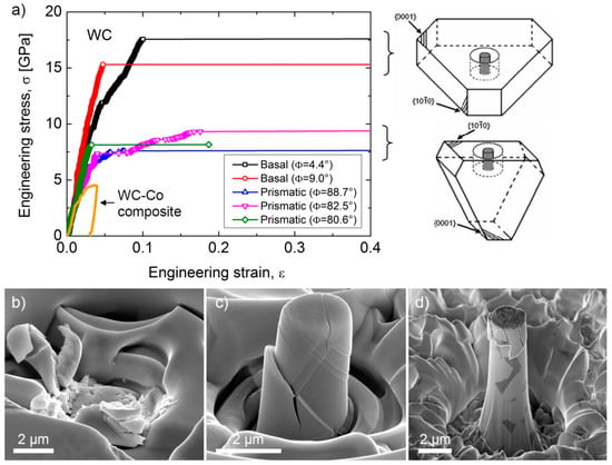 (a) Stress–strain curves during micro-compression tests of micropillars prepared from WC grains/single crystals with basal or prismatic orientation, together with the stress–strain curve of a micropillar prepared from WC–Co deformed up to ~3.5% and ~4.5 GPa. Deformation and damage mechanisms of the micropillars with (b) basal and (c) prismatic orientations and (d) micropillar containing WC grains and Co binder ligaments. By courtesy of Sandoval et al. [,], with copyright permission from Elsevier, 2018.