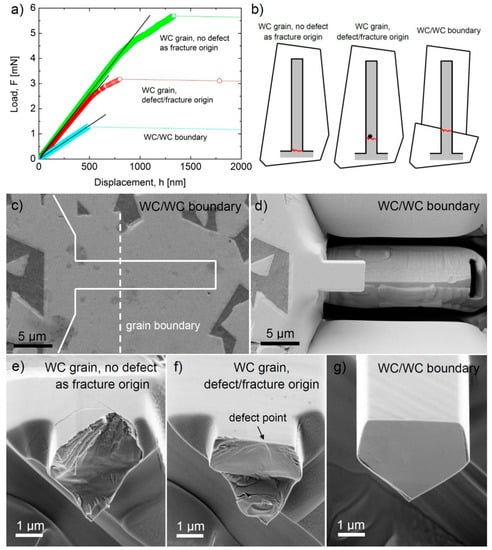 Cantilever bending strength testing and characterization: (a) Load-displacement curve of typical cantilevers, (b) schematic illustration of cantilevers with different fracture origins, (c) selection of cantilever position in the microstructure, (d) cantilever after bending test. Characteristic fracture surfaces of the cantilevers: (e) Fracture in WC without fracture origin/defect, (f) with nanometer-sized fracture origin, and (g) fracture at the WC/WC boundary [].