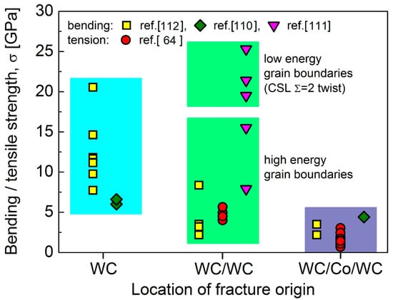 A very recent micro-cantilever test aimed at investigating the bending strength and deformability of individual WC grains and WC/WC boundaries [] revealed that the fracture strength depends very strongly on the fracture origin, as shown in Figure 10. On the basis of this finding, micro-cantilevers were classified into three groups according to the location and character of failure origin: