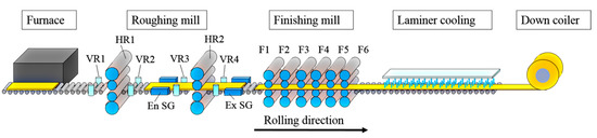 Generally, the curvature of the slab centerline can be controlled by adjusting the tilt angle between the horizontal roller pair of the roughing stands so that the difference in material flow rate over the slab width can be reversely compensated by the slight difference in reduction over the horizontal roller gap [3,4]. The slab form can be modified or corrected by the technique of continuous variable crown (CVC) of the work rolls [5,6]. In finishing mill stands, however, tilt angle control and differential force control are quite sophisticated and require very fast response due to the elevated rolling speed of the thinning strip and multiple close-to-one-another mill stands [7,8,9,10,11].