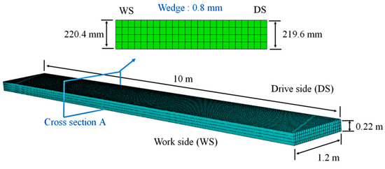 The finite element model consists of roughing rolls, edging rolls, and the entrance and exit side guides. The dimensions were based on the actual size layout of the No. 2 roughing mill (R2) in China Steel Corporation (CSC), Kaohsiung. To satisfy the slab geometry when passing through the second roughing mill stand, the slab model was set to 10 m long, 1.2 m wide, and 22 cm thick as shown in Figure 5. To ensure that contact between the side guide and the slab must occur in the simulation, the length of the slab should be at least 8 m. The purpose of this work was to investigate the effect of the side guide in correcting the camber of the slab in trend. In order to be able to reduce the simulation time, and nevertheless to obtain reasonable computation results to show the detail of camber, an initial slab length of 10 m was chosen. The slab model was given different initial wedges of 1 mm, 0.8 mm and 0.5 mm with the work side (WS) slightly thicker than the drive side (DS). Different degrees of wedge would result in different shapes of camber after the slab passes the roughing rolls. In order not to mix the effect of initial wedge and the effect of initial camber in the R2 roughing mill, we neglected the slab camber after first roughing mill (R1) and assumed a camber-free slab prior to roughing in R2.