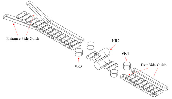 Although the entrance and exit side guides had been widely applied between roughing stands, there have been very few papers or literature examining the mechanism of side guides in correcting the slab curvature. Among the very few available papers, only the work of Byon et al. [13] focused on the design of guiding rollers, which were arranged on the inner flank of the side guides. Looking at the layout of the roughing mill in Figure 1, it is straightforward to think that the mechanism of correcting the slab curvature could not be realized by the side guides alone. The horizontal rolls and the edging rolls also simultaneously play a certain role in the correction mechanism. Therefore, this work was focused on the analysis of the mechanism of the side guides and the associated roughing mill components, which participate in correcting the camber of the slab during the roughing process. Only position-mode side guide was taken into account in this research.