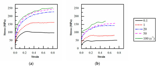 Flow curve of SAE1016 low carbon steel obtained from a GLEEBLE compression test; (a) 900 °C; (b) 1100 °C.