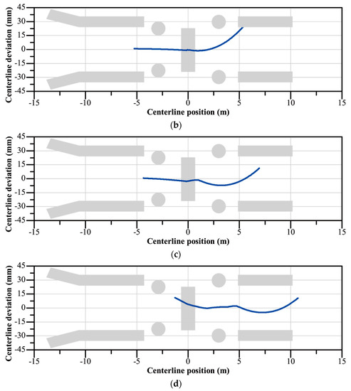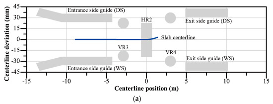 Figure 11 shows the instantaneous clips of the slab centerline profile at different moments. Relative to the size of the slab, the amount of camber and the size of the gap between the side guide and the slab are too small to be visually perceptible. We intentionally magnified the scale of the camber (centerline deviation) along the width direction in Figure 11 so that the camber and the centerline deformation are visually perceptible in the figure. At 2.5 s, the slab head was slightly cambered to the DS after passing through the roll-bite HR2 due to the initial wedge at the WS, as shown in Figure 11a. With the process of roughing, the centerline became cambered after the slab left the roll-bite. Eventually, the slab head was in contact with the side guide at about 4.3 s as revealed in Figure 11b. Immediately upon touching, the position-mode side guide arms began to close from the initial separation of 1300 mm to 1220/1224 mm. A side guide arm pressed at the slab head and restrained the slab from free cambering. At 4.7 s, as the side guide closed further, the slab centerline was deflected to the opposite side and became a deflected profile as depicted in Figure 11c. At this moment, the edging rolls VR3 exerted a reaction against the slab end. Eventually, the slab end completely left the entrance side guide and VR3 at 6.2 s and was about to leave the roll-bite. The centerline exhibited a deflected profile shown in Figure 11d. Note that the slab did not contact VR4 since VR4 is only actuated during reverse roughing and remains opened upon forward roughing.