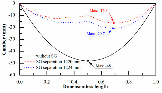It was found in Section 4.1 that the centerline profile of the slab had changed due to successive interaction between the slab and the roughing mill components. Now we further examine the effect of the separation distance of the side guide on the profile change and on the amount of camber of the slab. The amount of camber is defined here as the maximum deviation of the cambered centerline profile from the straight line connecting the slab head center point and the slab end center point. Figure 14 depicts the effect of the separation distance of the side guide on the amount of camber and on the centerline profile after roughing. The head and end of centerlines were made in coincidence with the centerline of the roughing mill so that the possible side walk of the slab was not taken into account. The length is expressed in a dimensionless unit. With the preset wedge of 1 mm, the slab experienced a camber of 48 mm after roughing at 18% reduction if there is no exit side guide installed behind the roughing mill stand and an unrestrained development of centerline profile is allowed. In contrast, with the exit side guide installed, the amount of camber was effectively reduced from 48 mm to 20.7 mm and 16.3 mm if the slab was corrected by the exit side guide, with a separation distance of 1224 mm and 1220 mm, respectively. As depicted in Figure 14, the centerline profiles exhibited a slight “wavy” shape. It is reasonable to expect that the narrower the separation distance of side guide, the more effectively the side guide could correct the amount of camber and improve the centerline profile. The deflection of centerlines has been interpreted by considering the reactions exerted on the slab.
