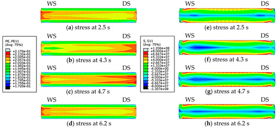 With the side guide installed, Figure 18 shows the strain and stress distribution under the combined loading of rolling pressure and the moment exerted by the exit side guide. Corresponding to the time sequence analysis of centerline camber shown in Figure 11, the slab head first freely cambered toward the DS in the initial stage of rolling, thus a larger longitudinal stretch strain (ε11) resulted at the WS up to 2.5 s, as shown in Figure 18a. Then beginning from 4.3 s, with the reaction of the exit side guide exerted on the slab head, the slab head was deflected toward the WS, larger longitudinal stretch strain was at the DS than at the WS from 4.3 s to 4.7 s, as revealed in Figure 18b,c. Figure 18d shows that the WS exhibited slightly larger longitudinal stretch strain again at 6.2 s when the slab was constrained by both the WS and DS side guide arms. The corresponding stress distribution is illustrated in Figure 18e–h. It is worthwhile to note that during the period between 4.3 s and 4.7 s, larger combined compressive stress appeared at the WS due to the correcting action of the exit side guide to the slab. Figure 18h shows a symmetric compressive rolling stress distribution again similar to that in Figure 18e.