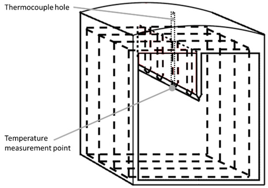 Heat treatments were performed in a Nabertherm 1750 furnace (Nabertherm, Lilienthal, Germany). The temperature was monitored by an S-type thermocouple (TCDirect, Dardilly, France). The thermocouple was calibrated prior to the treatment and then placed in a 10 mm deep and 1.5 mm in diameter hole drilled in the treated slice of material, in order to get a measurement representative of the temperature inside the slice, near the point where CT specimens will be machined (Figure 1).