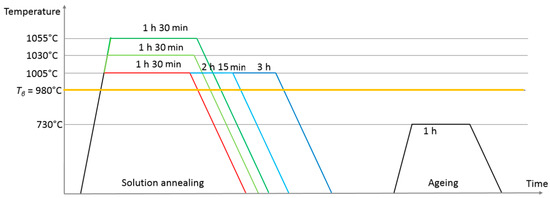From this initial bimodal microstructure, five lamellar microstructures were generated by means of different heat treatments. Particular attention was paid to the monitoring of the cooling rate so as to obtain a representative value of the actual cooling rate measured on a billet in industrial conditions. A schematic representation of these five heat treatments is shown in Figure 4. The first one was a solution annealing at Tβ + 25 °C for 1 h 30 min, followed by ageing at 730 °C for 1 h. Two additional treatments were derived by a modification in the solution annealing duration, which was 2 h 15 min in one case and 3 h for the other one. Finally the last two consisted of a modification in the solution annealing temperature with Tβ + 50 °C and Tβ + 75 °C for a duration of 1 h 30 min. A schematization of all heat treatments performed is shown in Figure 4.