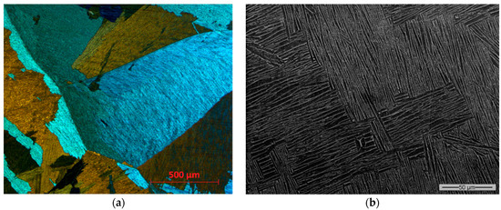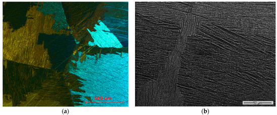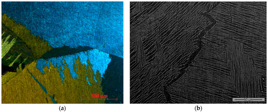 Lamellar microstructure obtained with annealing temperature Tβ + 25 °C for 1 h 30 min, viewed with polarized optical microscopy (a) and SEM (b).