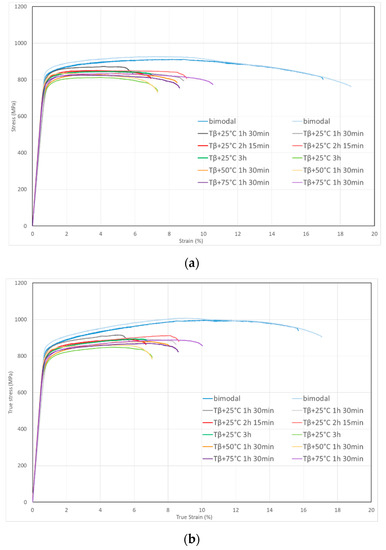 Engineering (a) and True (b) stress strain curves of the six microstructures.