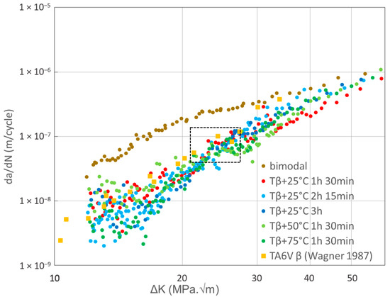 Furthermore, for these lamellar microstructures, two characteristic propagation regimes can be identified, each one characterized by a specific slope in the da/dN curve. The transition point between these two regimes can be estimated to approximately ΔKT = 25MPa√m and is identified in Figure 9 by the dotted rectangle.