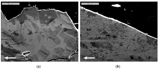 In these pictures, a clear difference can be noticed between the two ΔK values selected on both sides of the transition, respectively ΔK = 20 MPa√m and ΔK = 40 MPa√m, in the crack path and the fracture surface. Indeed, the crack path before transition (Figure 11a) exhibited an important deflection and associated roughness, associated to crystallographic propagation, while beyond the transition point the path was far smoother and had less deflection (Figure 11b). It should also be noticed that there was an important presence of secondary cracks before the transition whereas no secondary crack was found after transition.