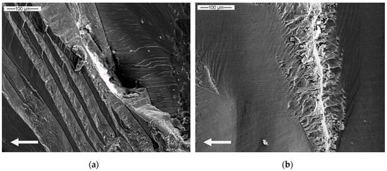 Examples of crack paths and fracture surfaces before and after this transition (Figure 10) are shown in the Figure 11; Figure 12, at ΔK = 20 MPa√m (Figure 11a and Figure 12a) and at ΔK = 40 MPa√m, respectively (Figure 11b and Figure 12b).