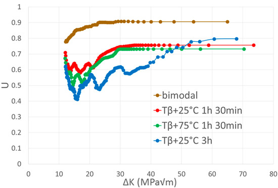 Again, it can be seen that the behavior of the bimodal microstructure was different from that exhibited by the lamellar microstructures, which in turn presented a similar behavior between each other. More precisely, the variation in solution annealing temperature had no effect on the opening stress, as indicated by the superposition of the curves for Tβ + 25 °C 1 h 30 min and Tβ + 75 °C 1 h 30 min. The curve for Tβ + 25 °C 3 h showed, however, a slight difference from the two other heat treated samples. On these lamellar microstructures three phases were distinguished. The first one, which lies between ΔK = 12 MPa√m and approximately ΔK = 15 MPa√m, was characterized by a decrease in the value of the U ratio as the ΔK increased. This decrease could be caused by the development of the roughness-induced closure at the beginning of the propagation.