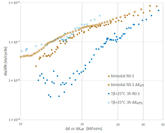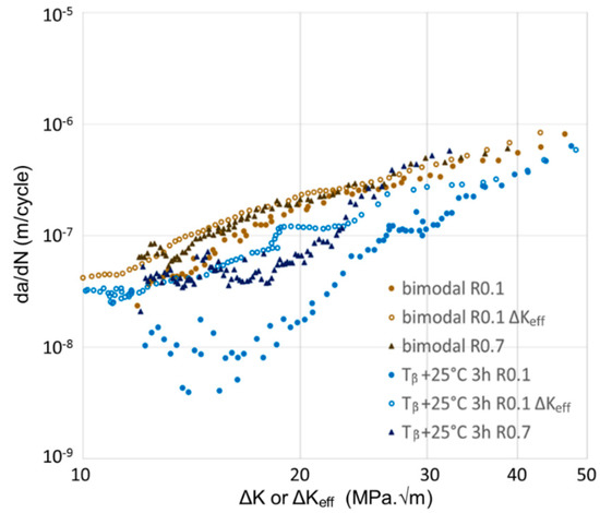 On the basis of these crack closure measurements, crack growth rates were plotted as a function of ΔK and the effective stress intensity range (ΔKeff) in Figure 14 for the bimodal microstructure and one lamellar microstructure. In the following section, only one lamellar microstructure was selected for time saving purposes, more precisely the one obtained after Tβ + 25 °C/3 h heat treatment. This plot also includes data obtained at a load ratio R = 0.7. This high mean stress loading generated a larger monotonic plastic zone size at the crack tip without modification of the cyclic plastic zone for a given ΔK value, so as to distinguish the effects of cyclic plasticity from the effects induced by monotonic plasticity at the crack tip, in particular their role in controlling the transition. It is also noteworthy that, as expected, no crack closure effect was detected during the tests at a load ratio of R = 0.7, so that the ΔKeff value can be considered as equal to ΔK.