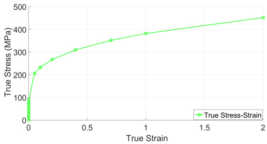 Commercial finite element software Abaqus is used for the simulations of LTE and NLTE processes. Copper specimens are modeled which have square and cylindrical shapes for LTE and NLTE, respectively. Von Mises plasticity model is employed as the constitutive model to simulate SPDs of workpiece. True stress-strain curve of copper specimen is illustrated in Figure 3. The dimensions of square and cylindrical specimens are 20 mm × 20 mm × 50 mm and length. Due to the design complexity of the modeled die geometries and the existence of SPDs, the explicit dynamic approaches are used. In order to reduce the computational cost and to speed up the simulations mass scaling is applied in the analyses. In the current analysis the kinetic energy of the model is kept lower than the internal energy to prevent potential errors that might occur due to inertial forces. Moreover, the models have been tested and validated through simulations without mass scaling, which gives confidence in the approach. To simulate the kinetics of the process, a velocity boundary condition is applied on the punch through its rigid body definition reference point. Punch speed is 4 mm/s and friction coefficient between the die and specimen surfaces is chosen to be 0.01. This value is considerably low compared to the ones used in other SPD processes such as ECAP, yet consistent with the values used in the TE literature. To ensure the removal of specimens from the die, the dummy bodies were modeled with the same constitutive definition with specimens and they were combined to each other with their contact surfaces by using tie constraints. The die geometries, specimens and punches were modeled as rigid bodies in simulations. Mesh properties of the simulation models were given in Table 1 and FE model of the LTE and NLTE processes are shown in Figure 4. The mesh size has been obtained considering the balance between the characteristic length and the wave speed. Boundary conditions were chosen to represent experimental extrusion process. Dies and dummy dies movement and rotation degree of freedoms are restricted through their rigid body definition reference point and punch could only move through extrusion direction.