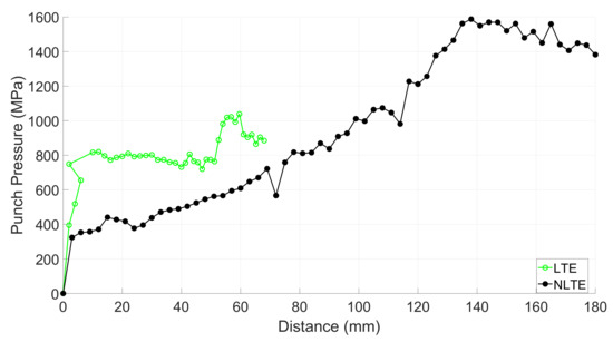 The simulations illustrate that there is an initial sudden increase of the load in LTE when the specimen head enters the twist zone (see Figure 6). Then the work piece advances twist zone without a significant load change. This behavior has also been discussed in the previous reports (see e.g., [27]). On the contrary, in NLTE, load proceeds its increase throughout the process. This is one of the prominent advantages of NLTE. However, the punch forces are dependent on the frictional coefficient. In these calculations, the coefficient is set to be low (0.01). If it gets higher, the punch forces would increase for both processes. However, the sharp increase in the linear case is due to the sudden change in the cross-section, which does not exist in the proposed smoother nonlinear process. Since the cross-section areas are different for both cases punch pressures are compared in Figure 7 for a better presentation. Similar observation exists here as well at the initial part; however, the pressure goes up to much higher values in the case of NLTE. The force as well as the pressure could easily be reduced in the proposed nonlinear case by changing the geometry of channel (twisting rate) and the increase in the number of passes would give the desired total strain.