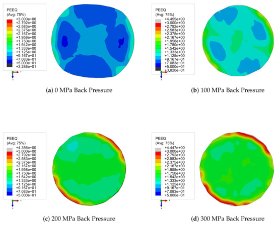 Equivalent plastic strain distribution in NLTE specimen depending on the applied back pressure.