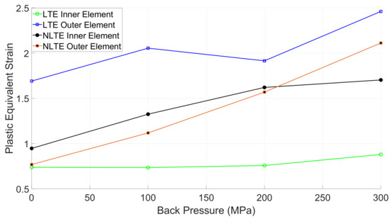 The deformed geometry of specimen during processes and the equivalent plastic strain distribution are directly affected by the applied back pressure (see e.g., [28]). In this context, Figure 8 and Figure 9 show the equivalent plastic strain distribution and the change in the geometry of the specimen depending on the back pressure values. It can be seen that an increase in back pressure yields more homogenous equivalent strain distribution for both processes. The specimens fill the die better than the case without the applied back pressure. Moreover, the final cross-section shape resembles the initial geometry with the applied back pressure. This is specific to the current design due to the presented evolution of the cross-section, while in some other types of extrusion processes the effect of back pressure is not pronounced (see e.g., [29]). To decide the amount of the applied back pressure value in simulations, an approximation to the calculated theoretical equivalent plastic strain value is used here. Figure 10 shows the equivalent plastic strain distribution of inner and outer element of LTE and NLTE specimens according to various back pressure values. It can be seen that plastic equivalent strain evolution in NLTE process on the cross-section is more homogeneous compared to to traditional LTE process for various back pressure values. 200 MPa back pressure value is identified from Figure 10 to obtain the theoretical value of 1.4. Therefore, from now on this value of back pressure is applied in all FEM simulations of LTE and NLTE processes.